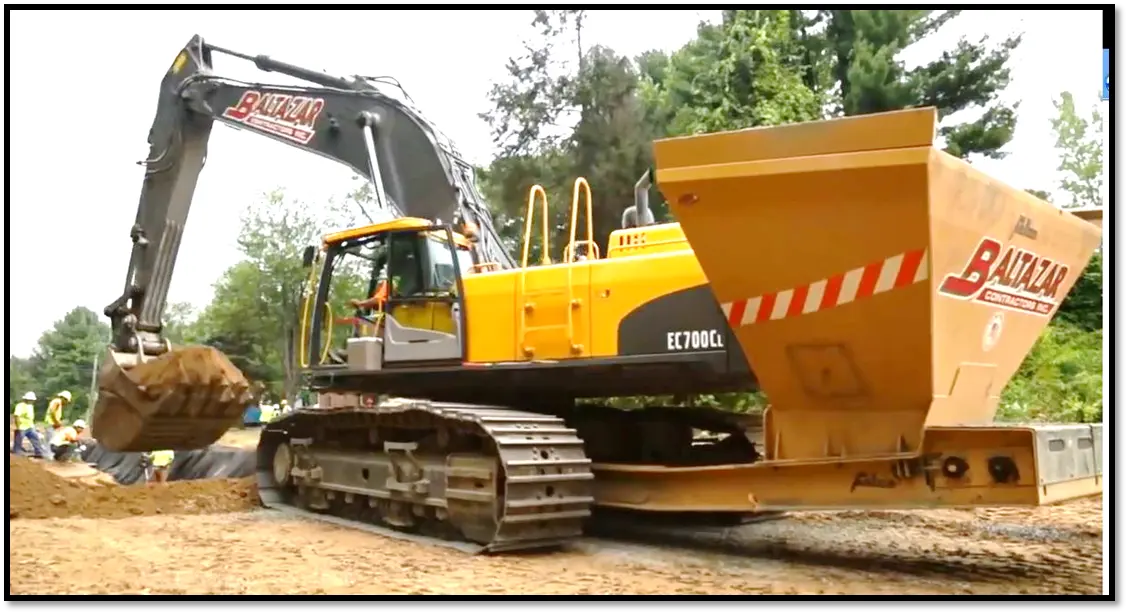The Bedding Conveyor allows pipe bedding material to be delivered and placed with the lead excavator. A hopper behind the excavator is filled with bedding material, then a hydraulic motor runs the conveyor belt which transfers the material that comes out the bottom of the hopper between the excavator tracks to the front of the excavator. Typically operators shoot the amount of material they need into their digging bucket to then place on the pipe in the trench.